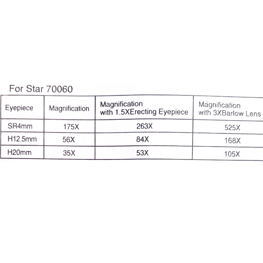 | Maximum magnification power: | 525X; (You can see the surface of the moon); |