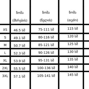 | ზომა (მხრების): | XS (46.5 სმ), S (49.1 სმ), M (50.7 სმ), L (52.3 სმ), XL (53.9 სმ), 2XL (55.5 სმ), 3XL (57.1 სმ). |