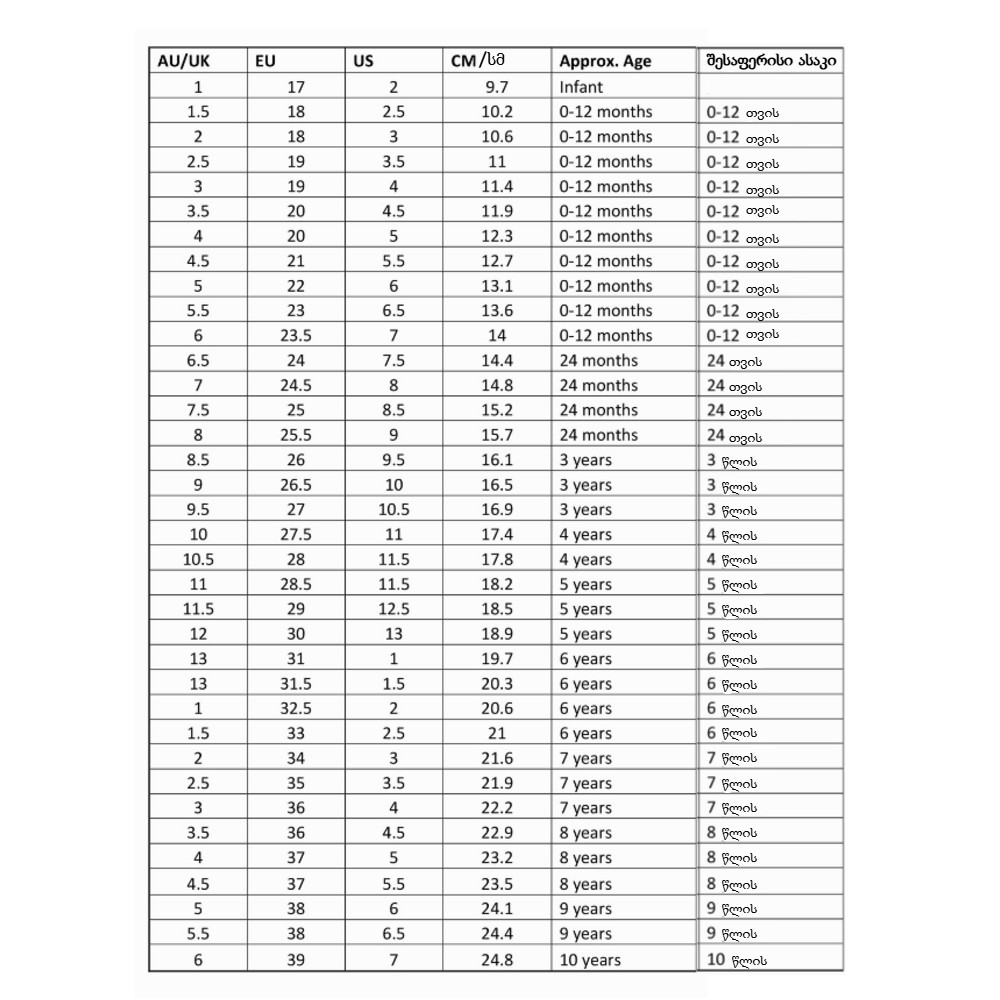 ზომებში მითითებულია ბავშვის ფეხის სიგრძის ზომა