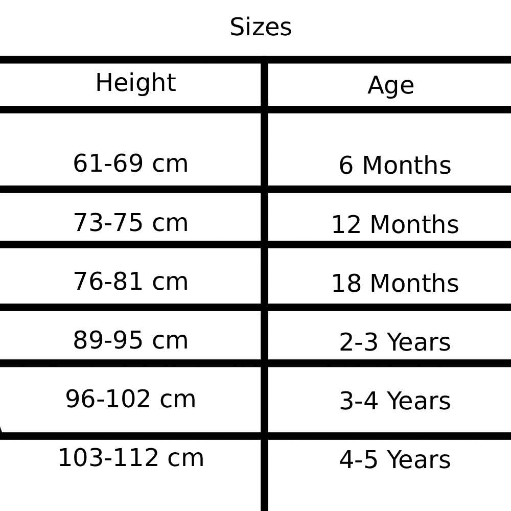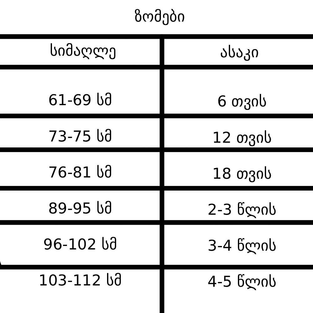 | ზომა: | 61-69 სმ (6 თვის), 73-75 სმ (12 თვის), 76-81 სმ (18 თვის), 89-95 სმ (2-3 წლის), 96-102 სმ (3-4 წლის), 103-112 სმ (4-5 წლის) |
