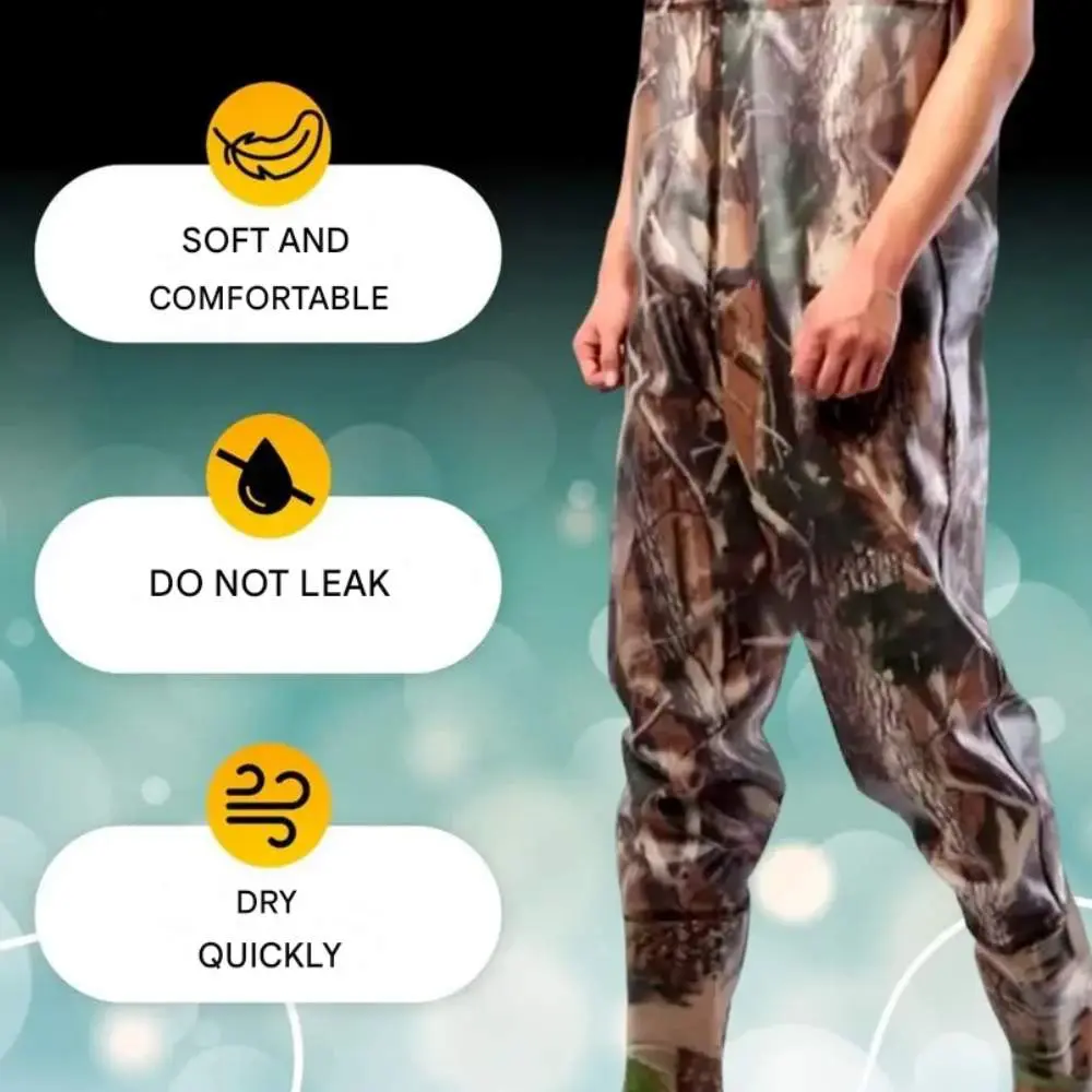 - წყალგაუმტარი და გამძლე მასალა საიმედოდ იცავს ტანსაცმელსა და სხეულს ტენიანობის, ტალახისა და ცივი წყლისგან, ხოლო ინტეგრირებული კომუფლირებული ჩექმები უზრუნველყოფს სტაბილურობასა და შეუმჩნევლობას ბუნებრივ გარემოში.