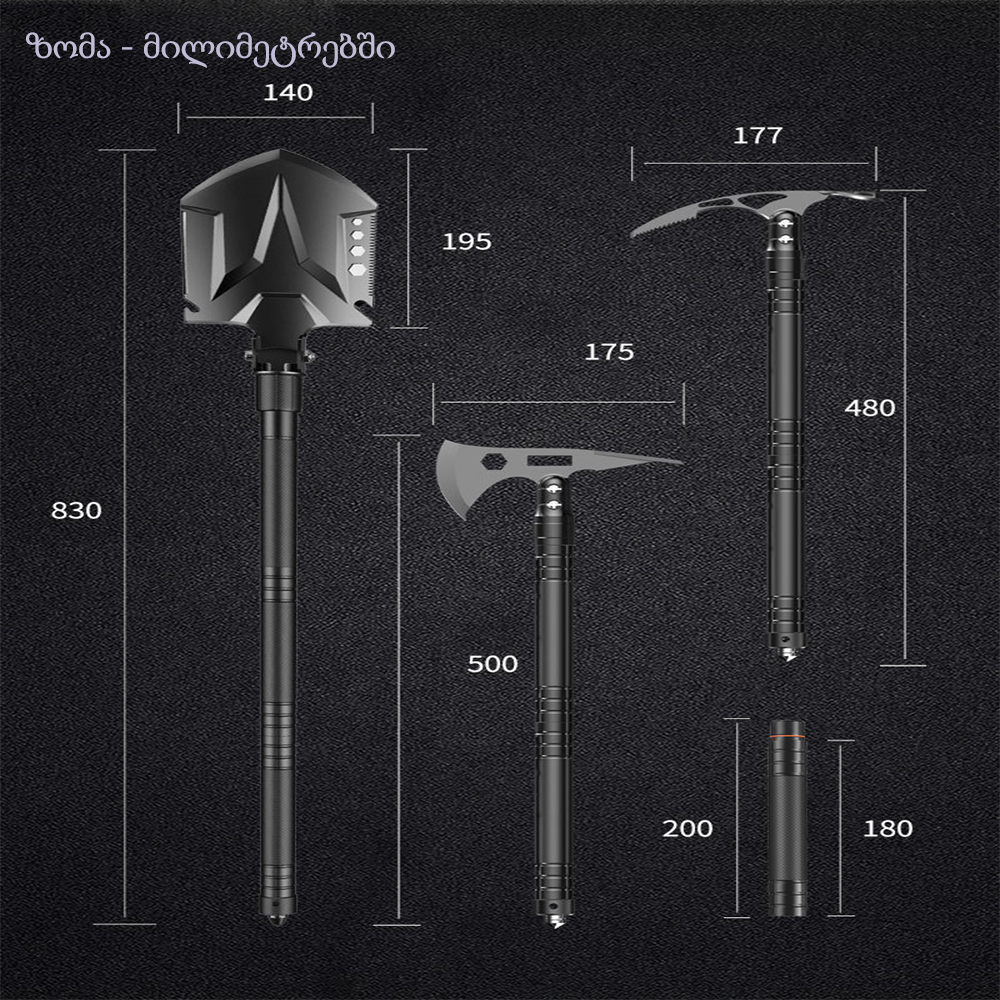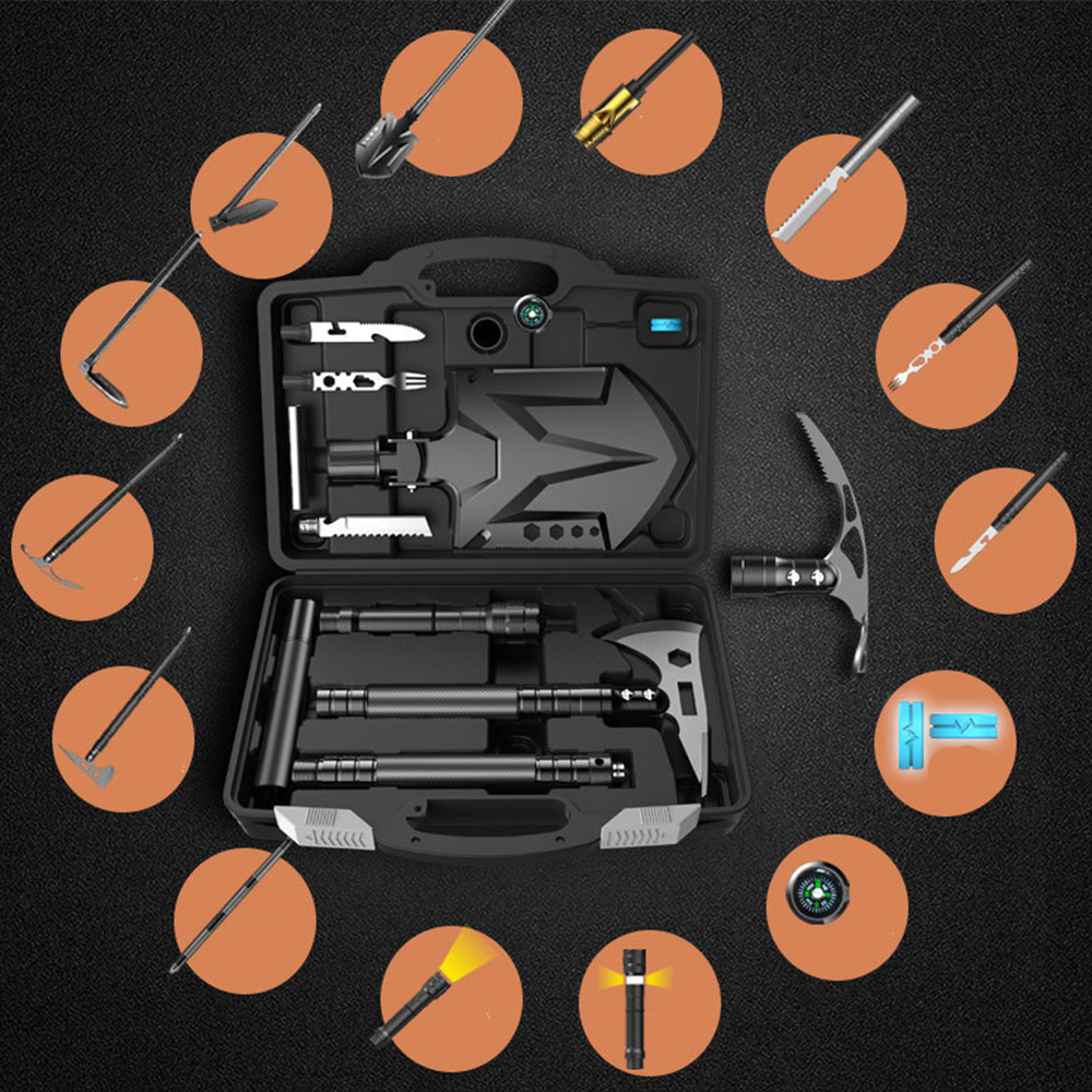 14 ცალი სალაშქრო ნაკრები (ნაკრები გადარჩენისათვის/ნაჯახი ხერხიანი/ხერხი/დანა/მანათობელი (ფანარი)/კომპასი/აქსესუარები)