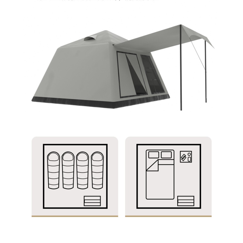 Эта палатка представляет собой профессиональную палатку, защищающую от дождя, с четырехсторонними расширениями (4 небольших помещения для хранения вещей), двойными дверями как на внутренней, так и на внешней палатке , а также сетчатой конструкцией на дне обеих сторон внутренней палатки для обеспечения ее вентиляции и воздухопроницаемости .