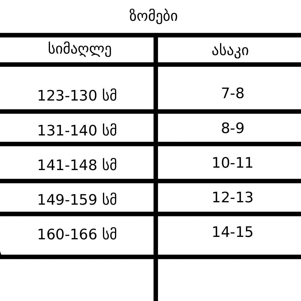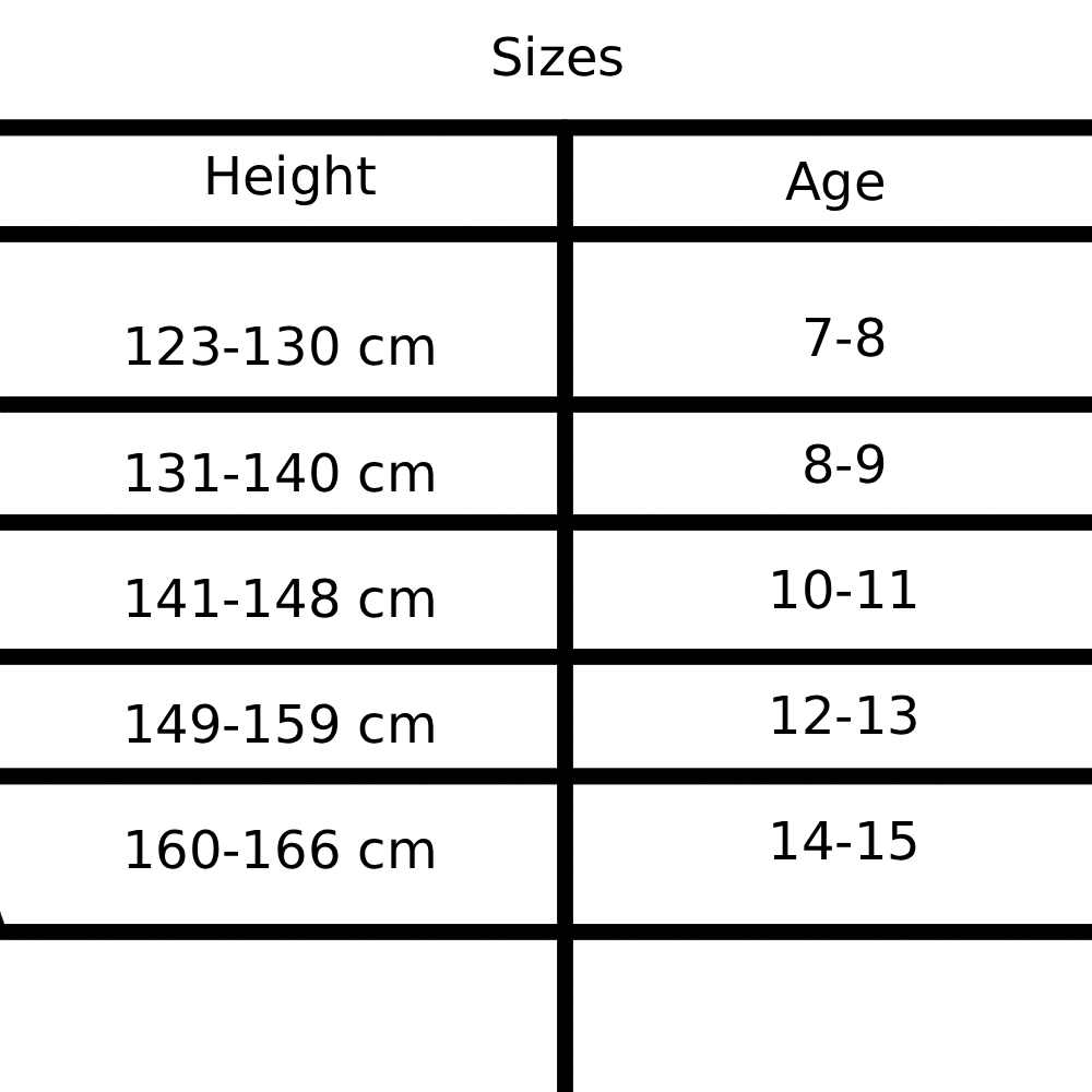 | Размер: | 123-130 см (7-8 лет), 131-140 см (8-9 лет), 141-148 см (10-11 лет), 149-159 см (12-13 лет), 160–166 см (14–15 лет) |