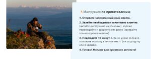 | Упаковка: | алюминиевый дой-пак с замком-молнией. Упаковка предназначена для заваривания пищи внутри. |