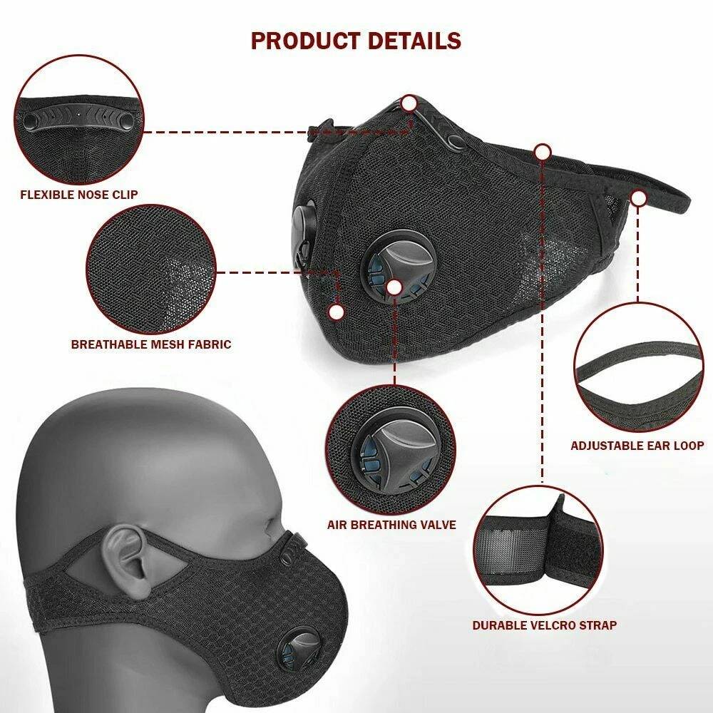 Это многоразовая спортивная маска с фильтрами (также известная как маска-респиратор), предназначенная для защиты от пыли, загрязнений и других частиц во время занятий спортом на открытом воздухе, таких как езда на велосипеде, бег или альпинизм. Она оснащена клапанами выдоха, которые облегчают дыхание и уменьшают накопление влаги и тепла внутри маски