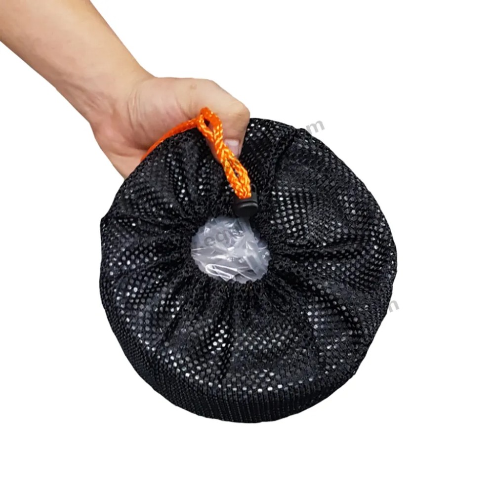 Чашка, кастрюля и сковорода сложены друг на друга, а затем упакованы в сетчатые мешки, их легко переносить во время вашего путешествия.